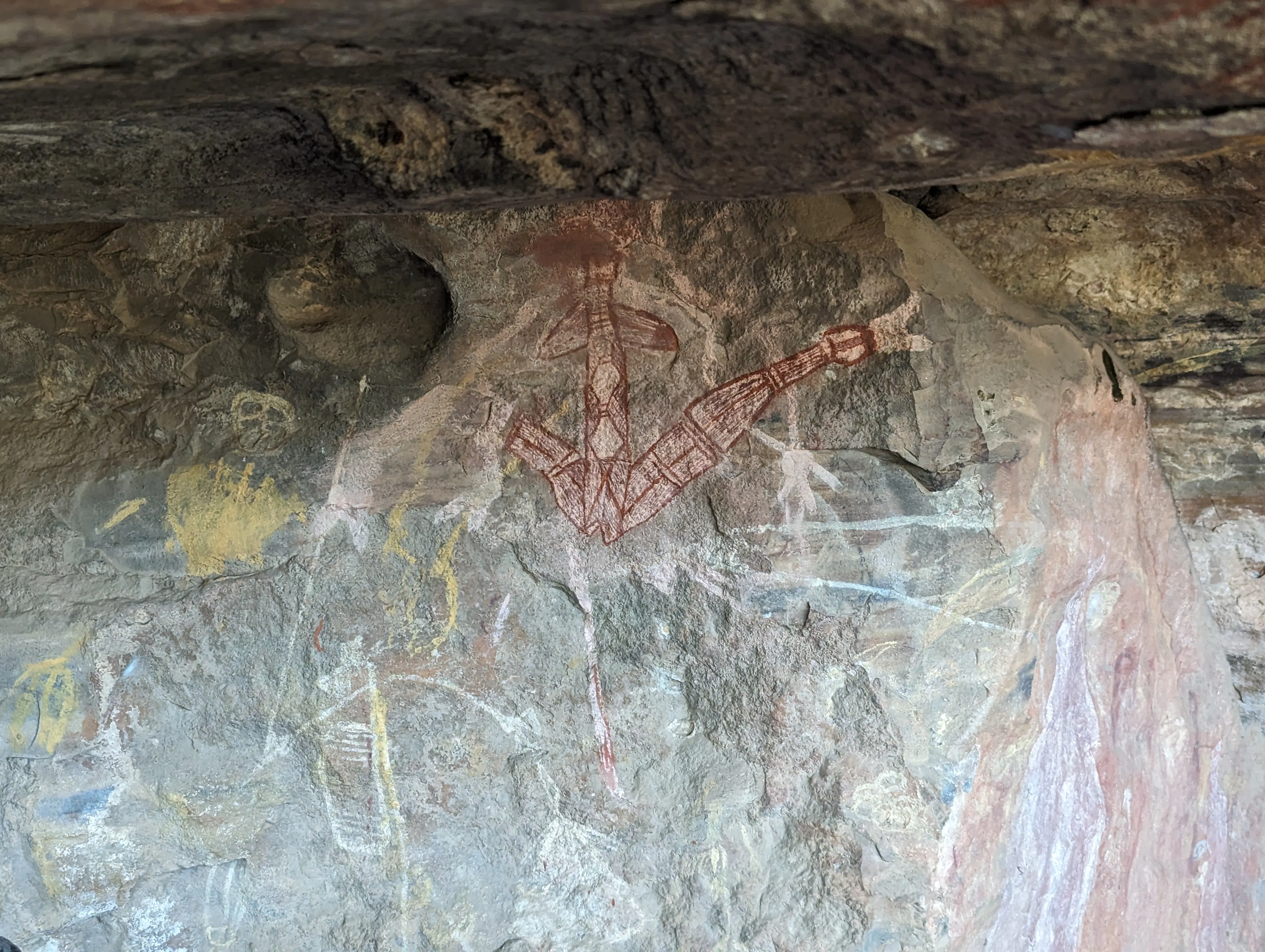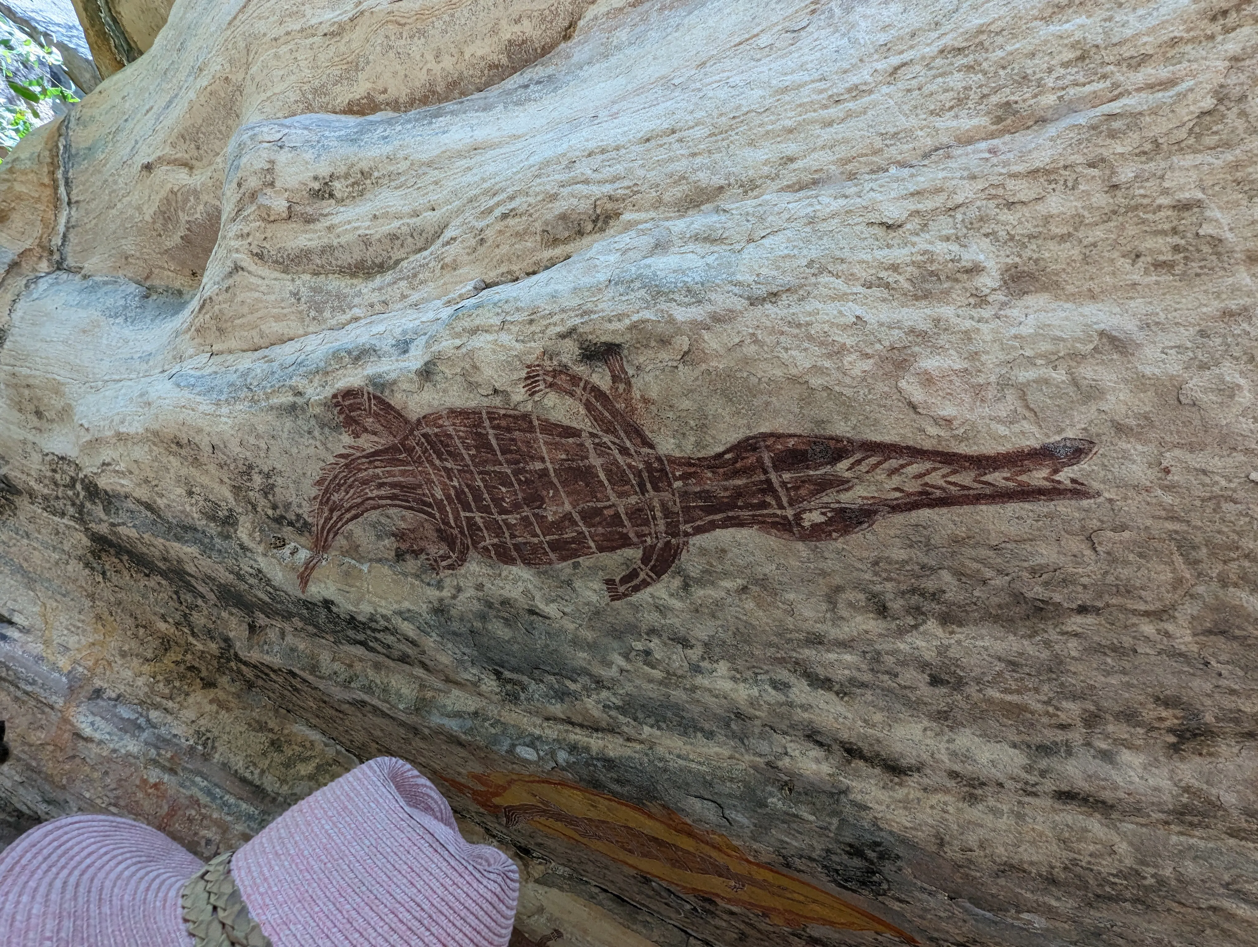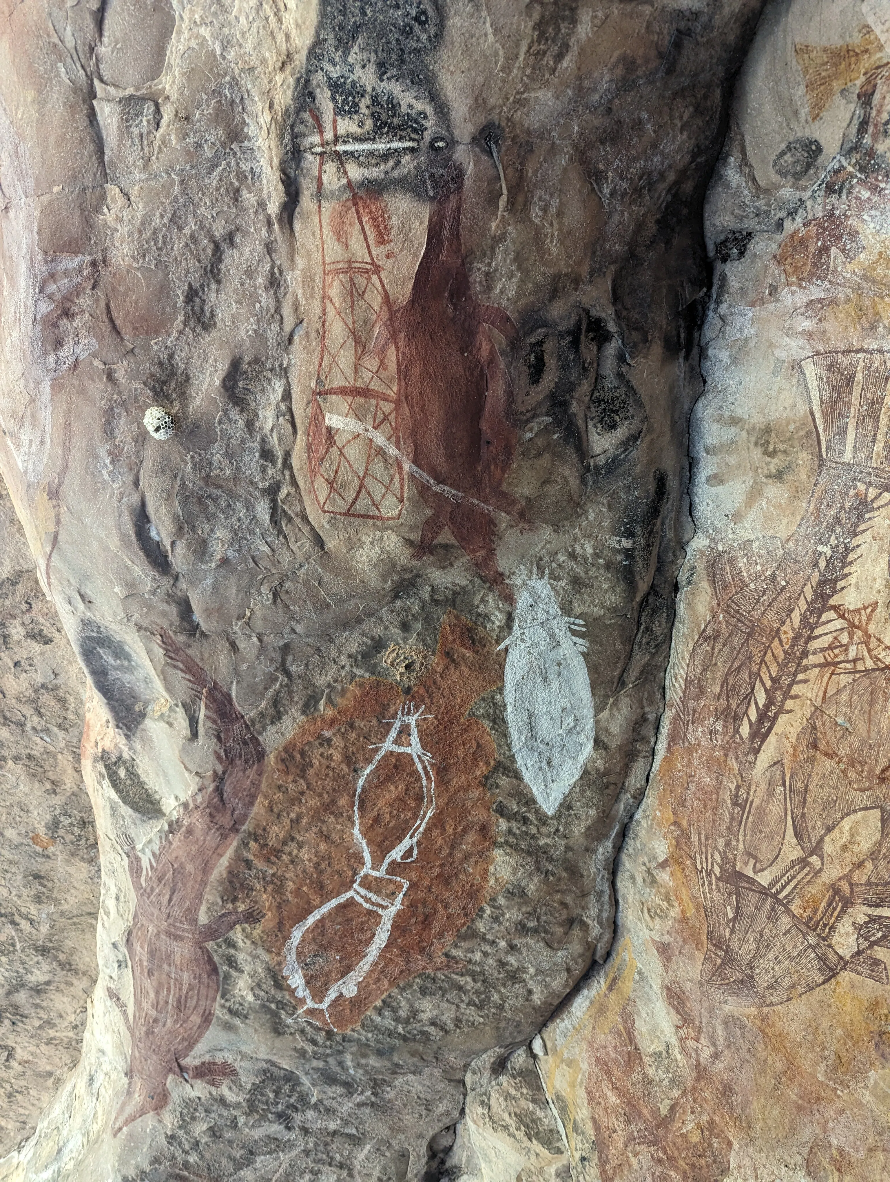 After a bit of morning tea (nothing quite like dunking scotch finger biscuits into tea from a thermos) and a brief sighting of a wallaby with a joey in her pouch, we did some moderately intense rock hopping to get to a rock art gallery in a cave overlooking the floodplains. And it was simply astounding. Seeing layers of art spanning thousands if not tens of thousands of years, depicting creation spirits, people, animals and plants, in one of the most remote and untouched places in the country, made for a very intense and amazing experience.
