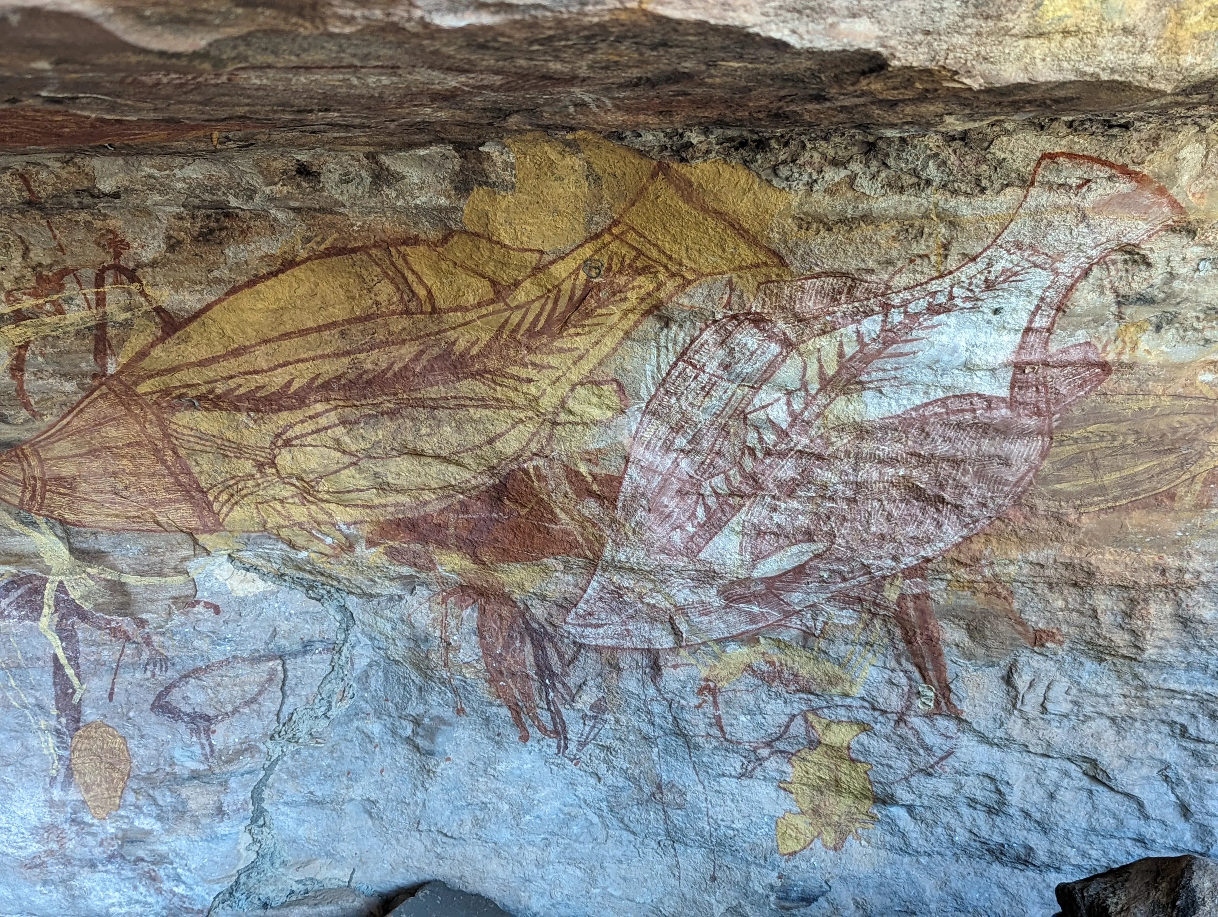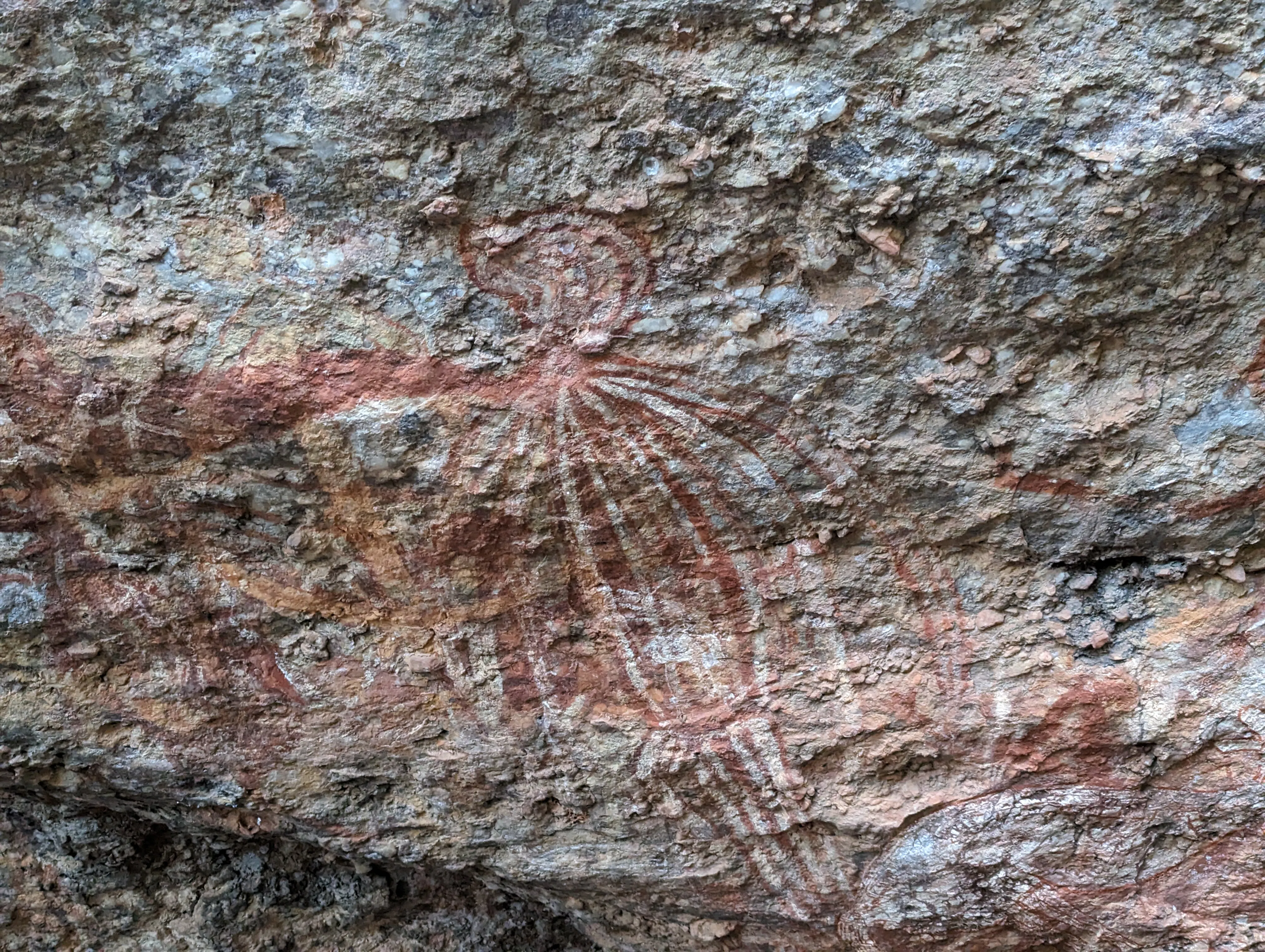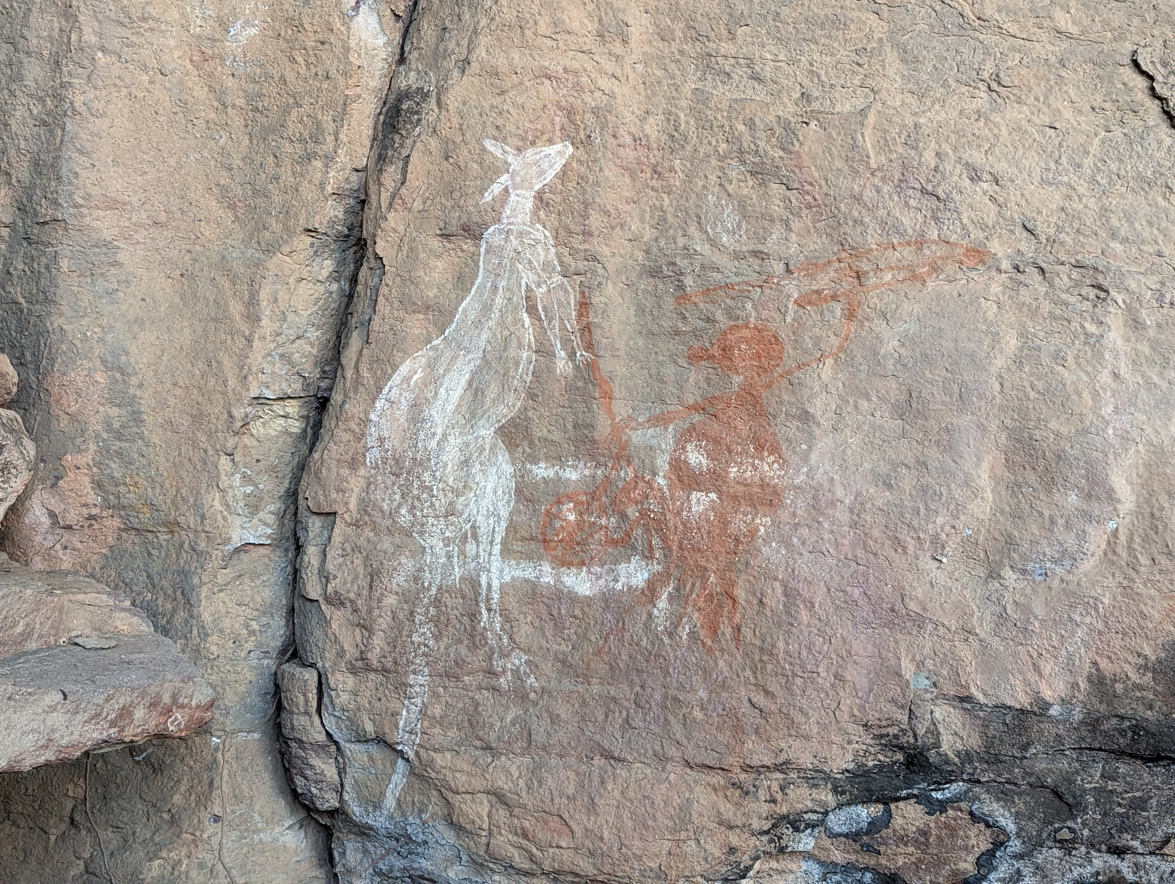 After a bit of morning tea (nothing quite like dunking scotch finger biscuits into tea from a thermos) and a brief sighting of a wallaby with a joey in her pouch, we did some moderately intense rock hopping to get to a rock art gallery in a cave overlooking the floodplains. And it was simply astounding. Seeing layers of art spanning thousands if not tens of thousands of years, depicting creation spirits, people, animals and plants, in one of the most remote and untouched places in the country, made for a very intense and amazing experience.