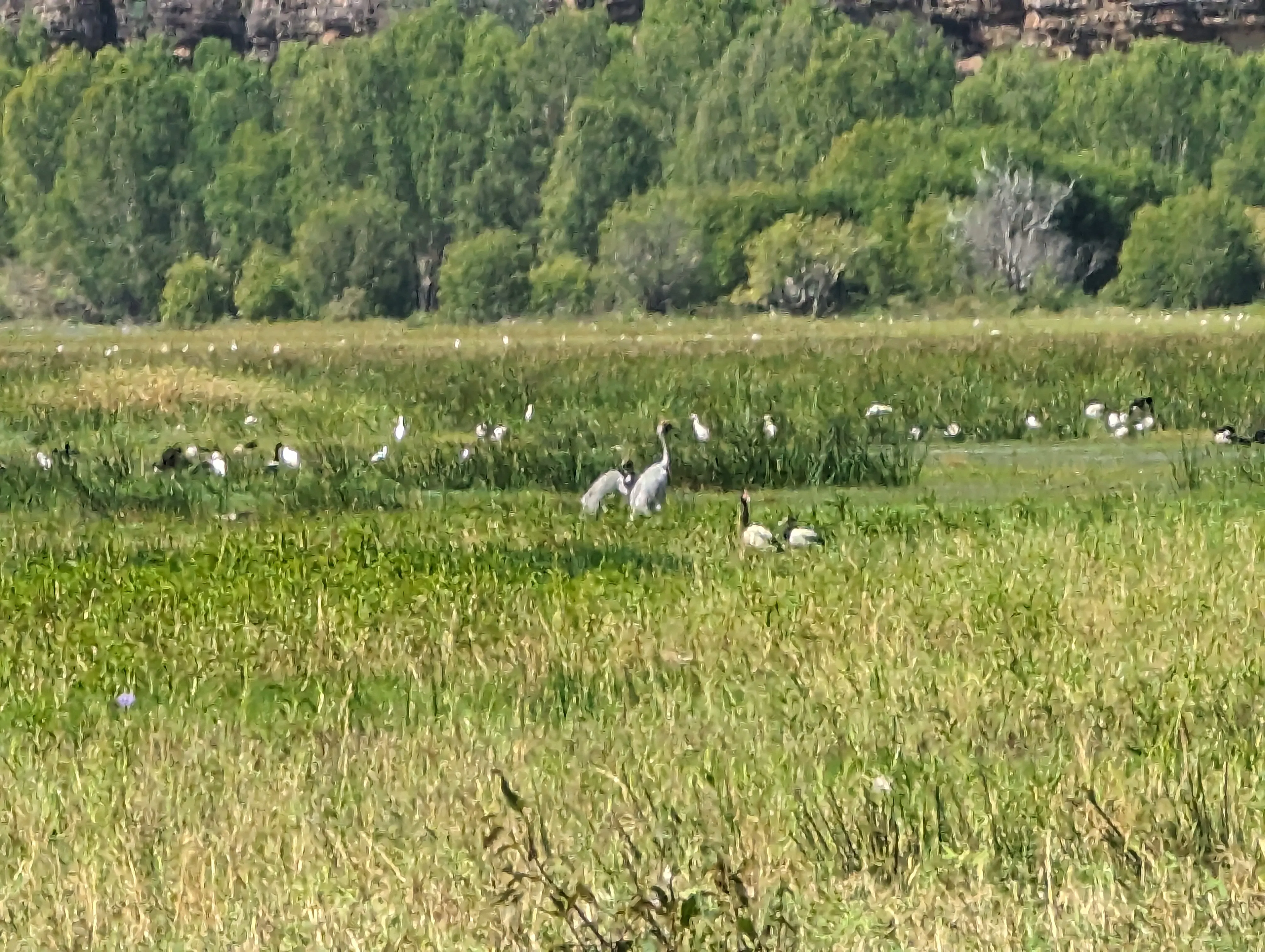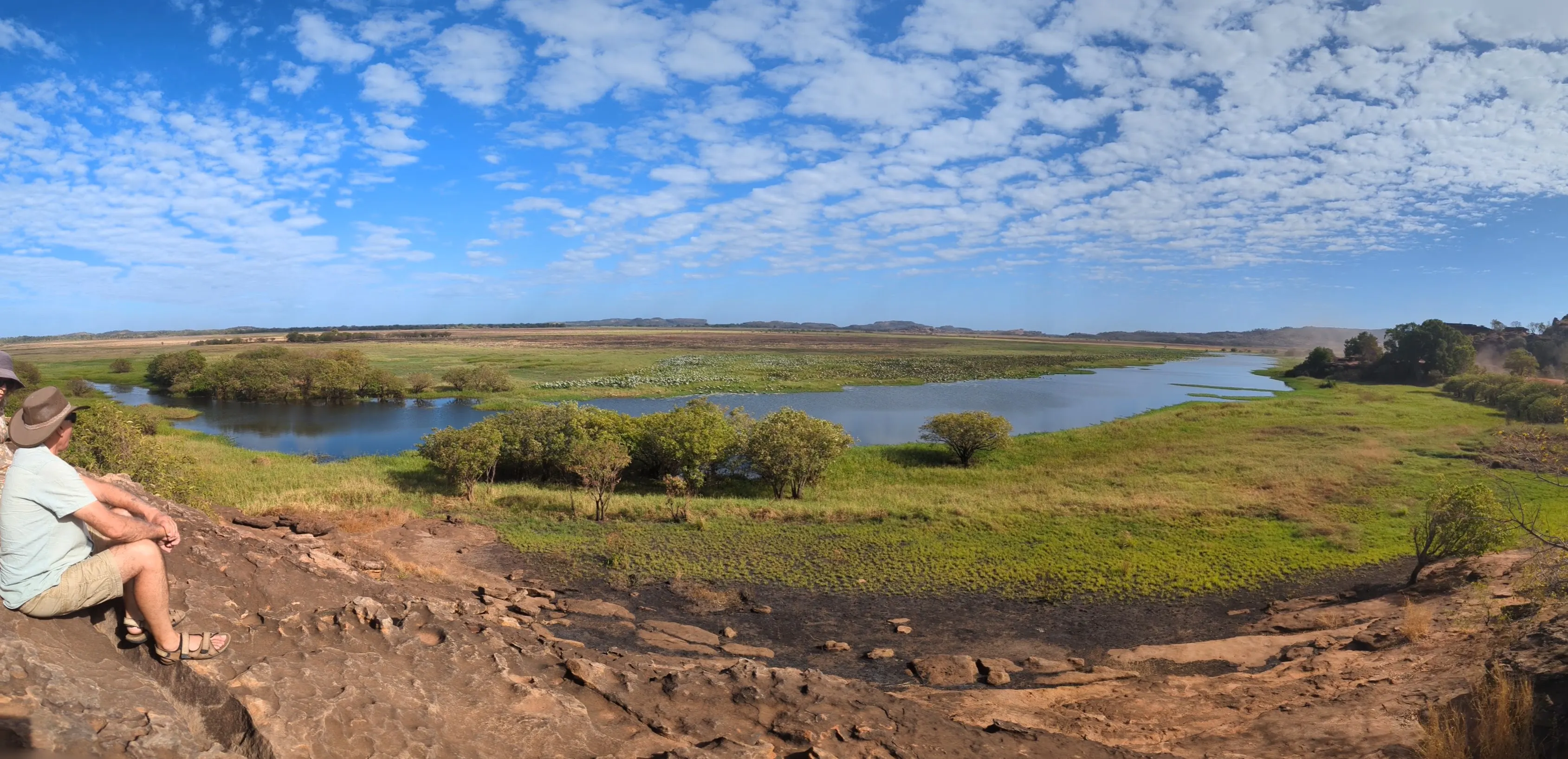 We drove northeast along a red dirt road through the most spectacular landscape, with wide flat floodplains on our left and the huge sandstone cliffs of the escarpment on our right. We had a quick stop to climb a rocky outcropping to get a better look at the East Alligator River and the surrounding floodplains.