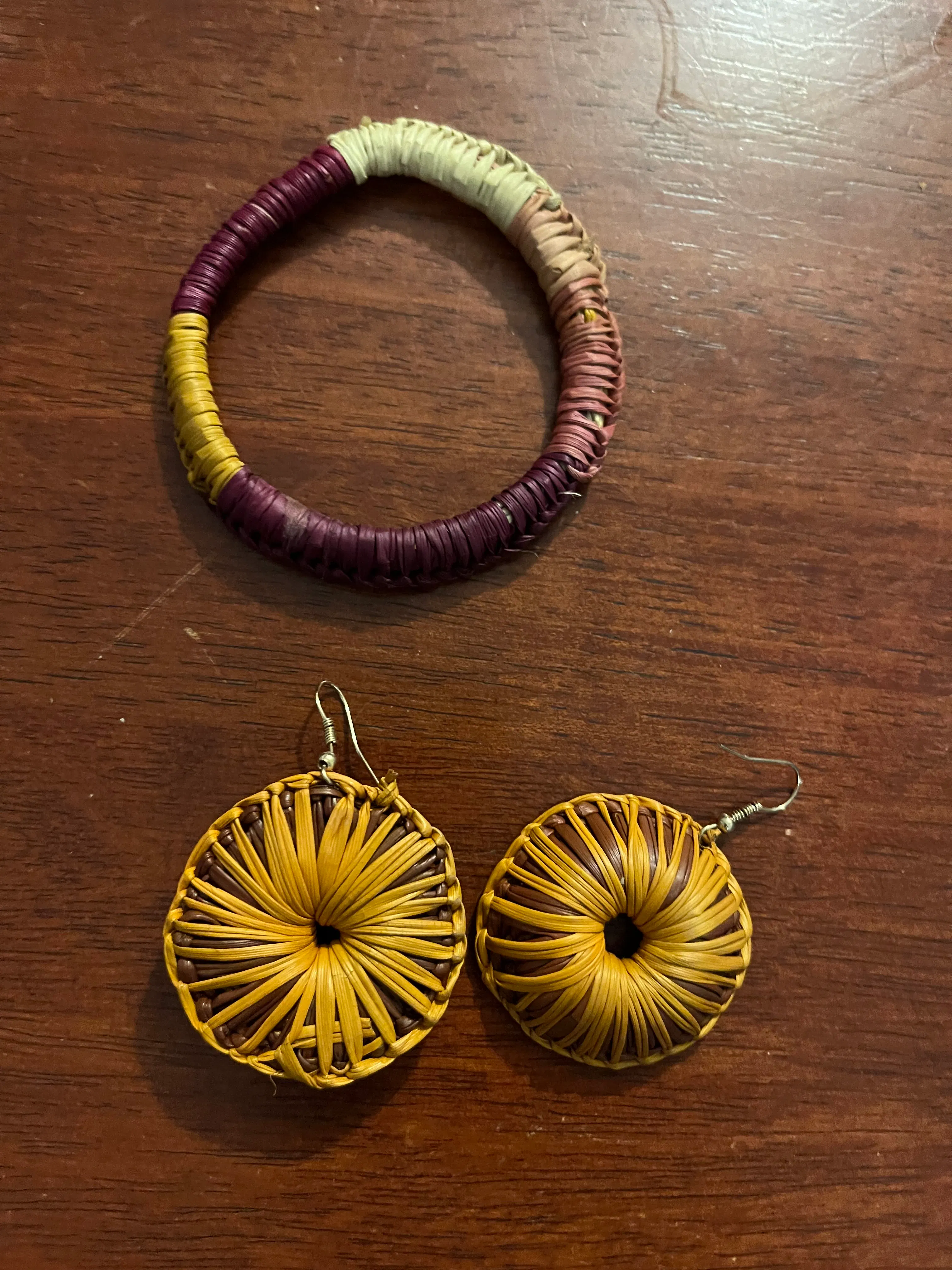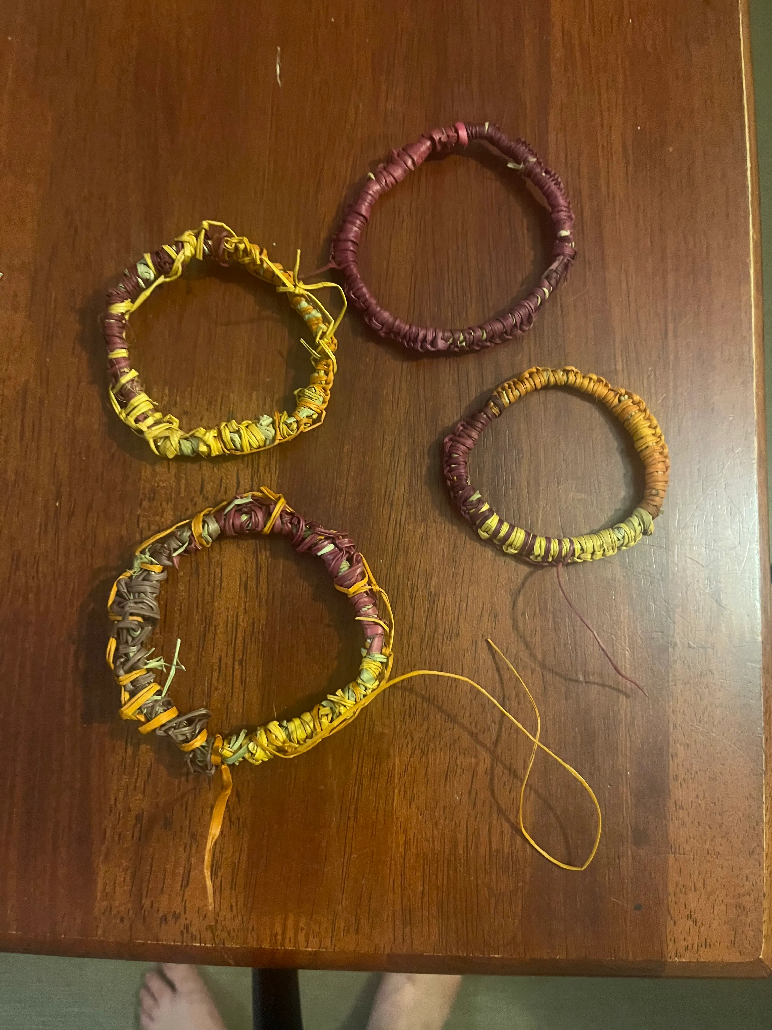 On Thursday morning the girls and I went to a weaving session with a local elder at the Bowali Visitor Centre, which was really special. We sat outside under some trees, with Patsy who has spent her whole life in Kakadu and was a weaver and artist, as well as a non-Aboriginal ranger called Megan. Patsy talked us through how to use 3 strands of non-dyed pandanas to form the basis of a bracelet, and then how to weave the coloured strands around it. We talked lots as we worked, learning about how the pandanas is collected, how the various roots and berries were collected to create the dyes, how the skills had been traditionally used, and how they were now used primarily to create art and income.