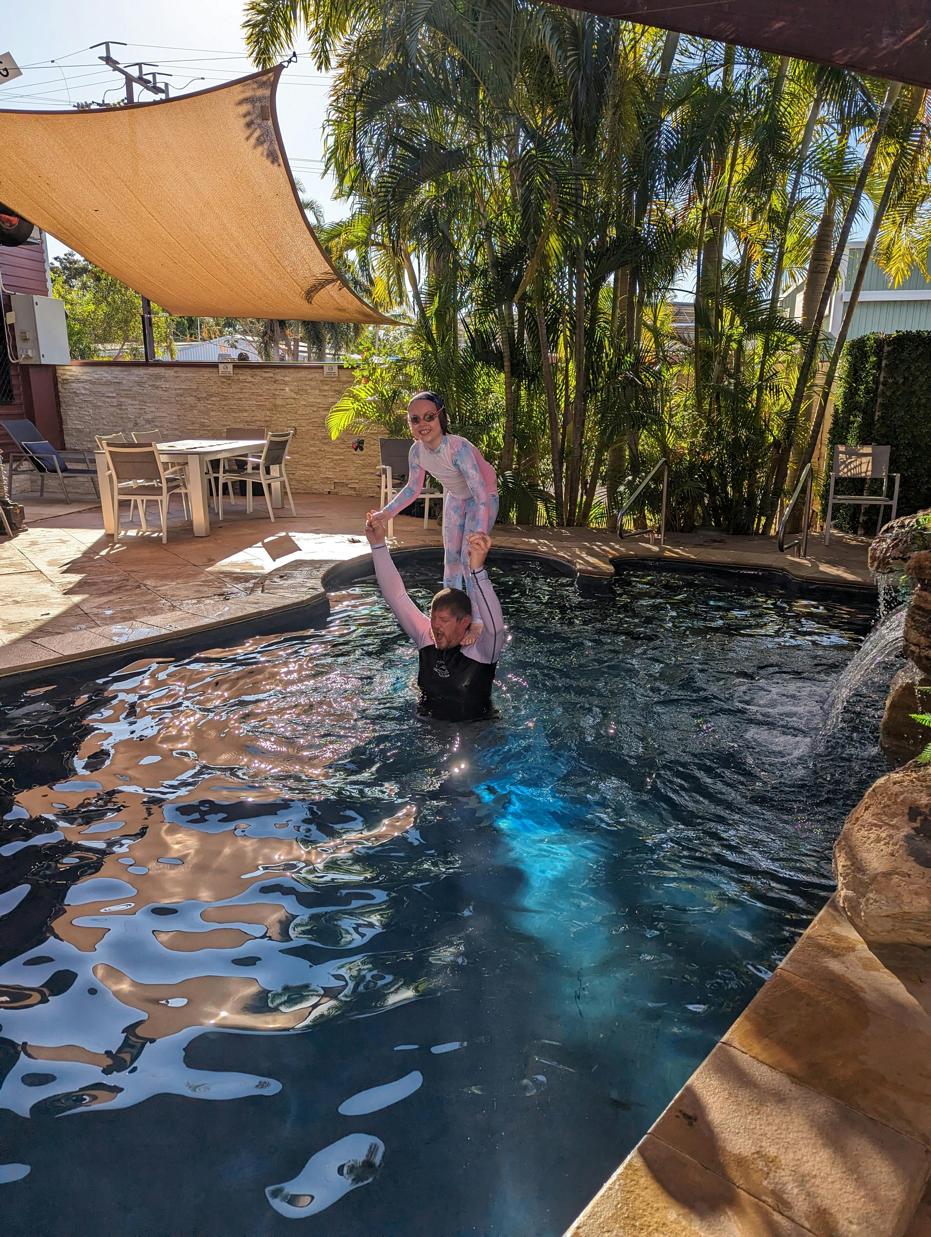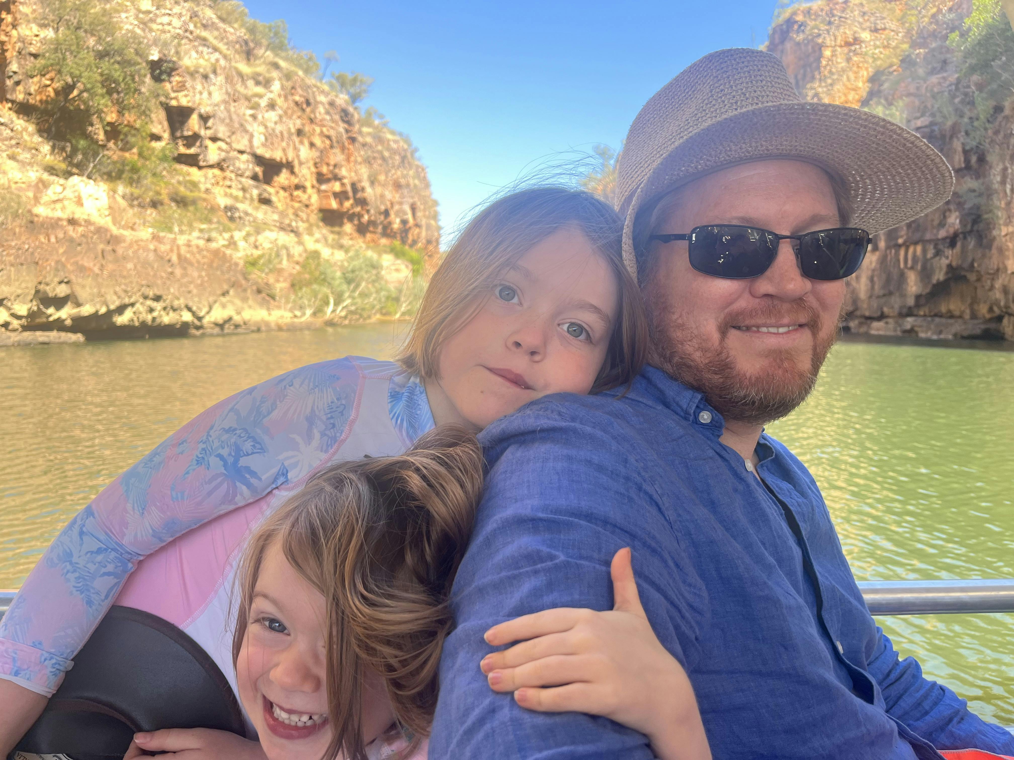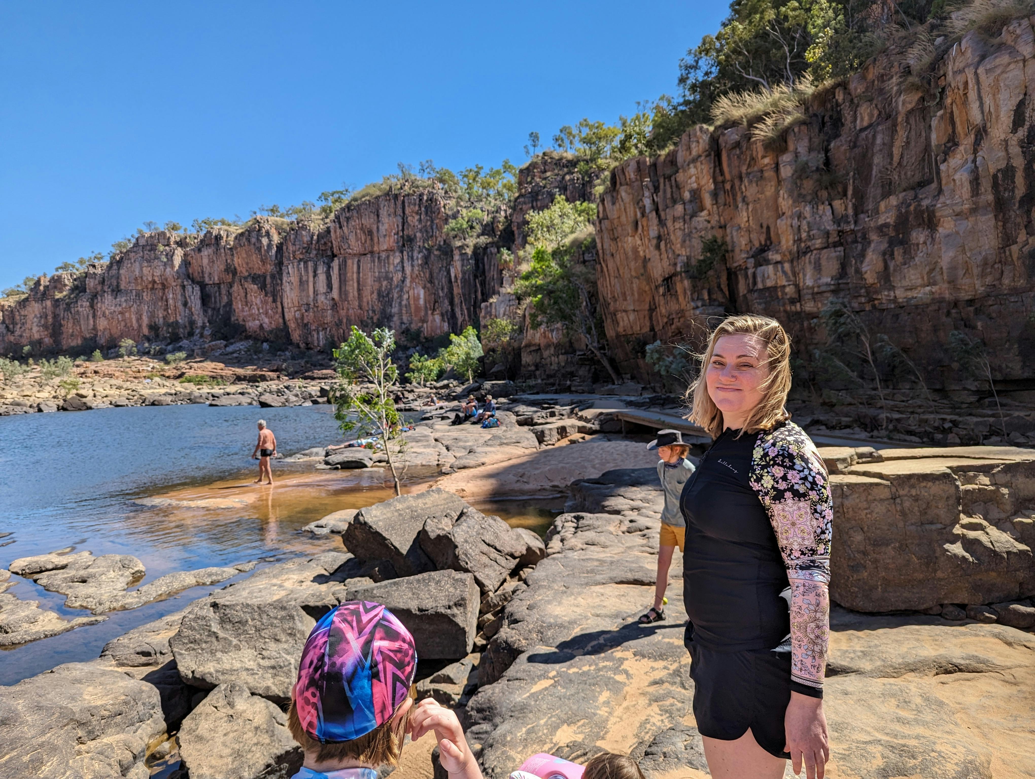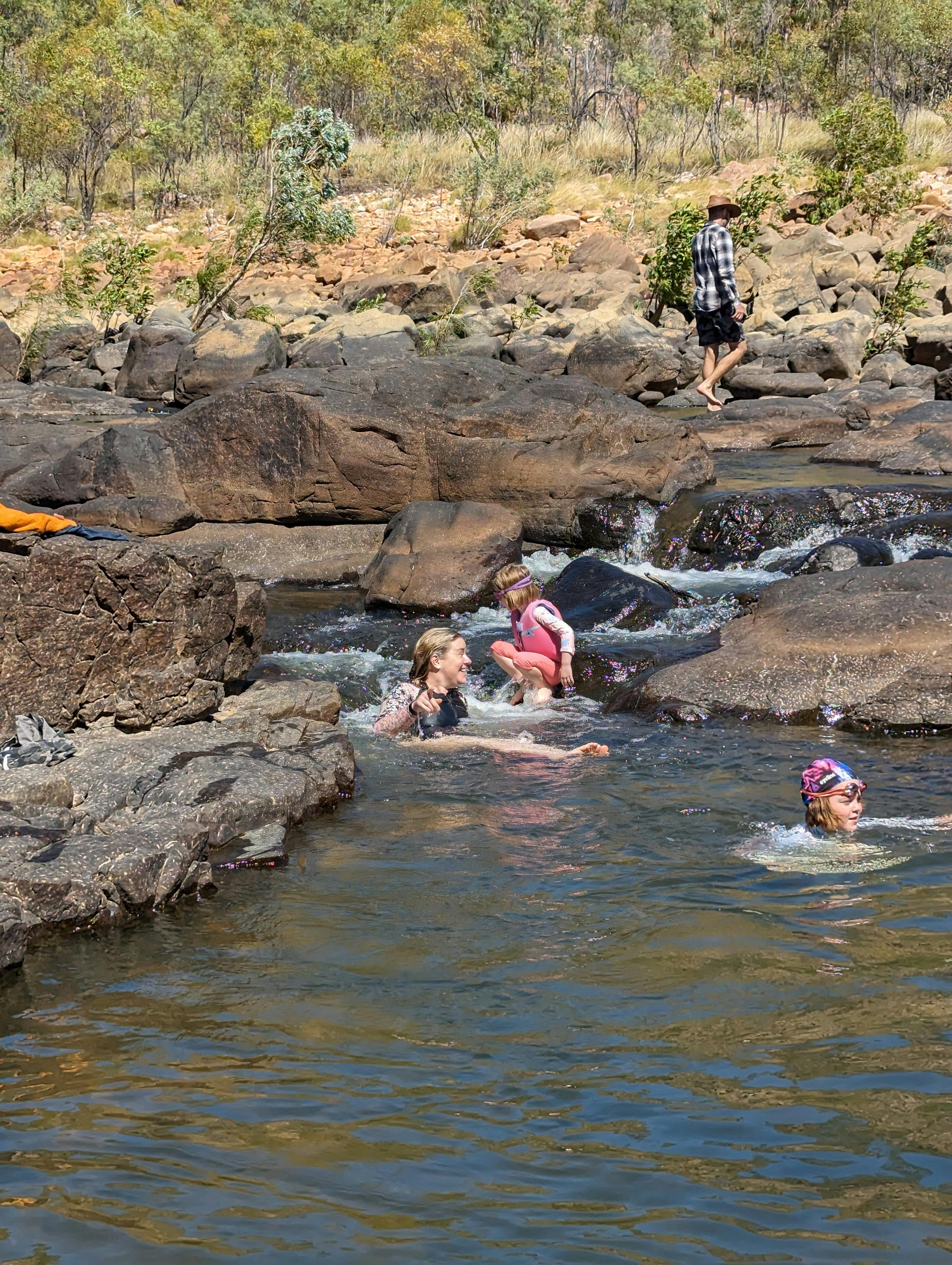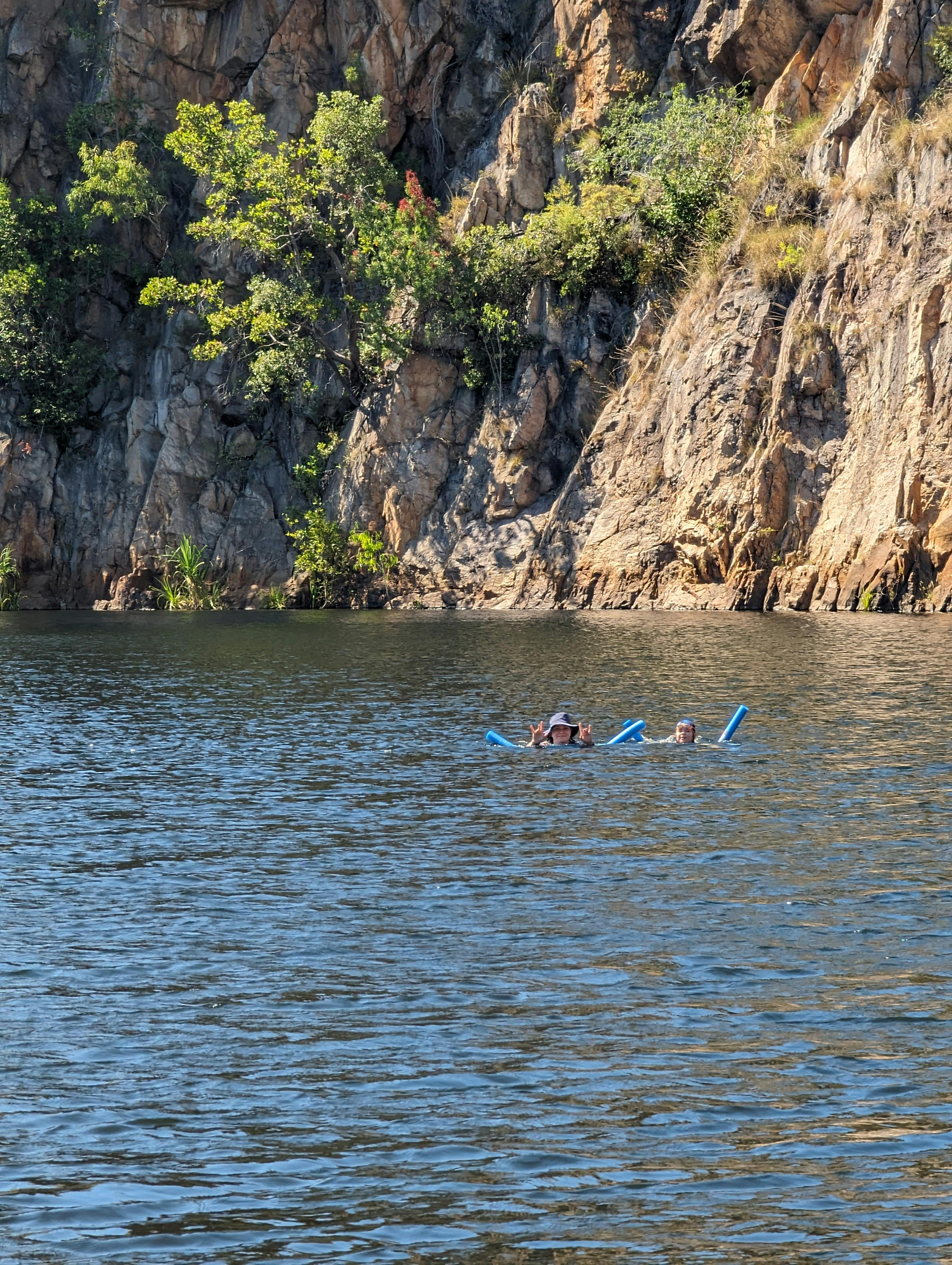 Saturday was a tricky day, as it was a year since I lost my amazing Dad. I knew I wanted to get out into nature somewhere, so on the recommendation of my official trip sponsor (hi Claire!) we headed to Leliyn (Edith Falls) in Nitmiluk National Park. And it was just beautiful. Not too busy, and hardly anyone in the water. Toby chose to wait it out (he's really not keen on nature waterways, especially the deep ones!) but Bob and I and the girls made the 150 m swim from the banks over to the falls, which felt like a real accomplishment (even with assistance of some pool noodles). The water was brisk but crystal clear, and the craggy cliffs overhead were just gorgeous in the sunlight. Josie definitely feels the cold a lot quicker the Nora, so Bob took her back to shore quickly, while Nora and I took our time, enjoying the water.