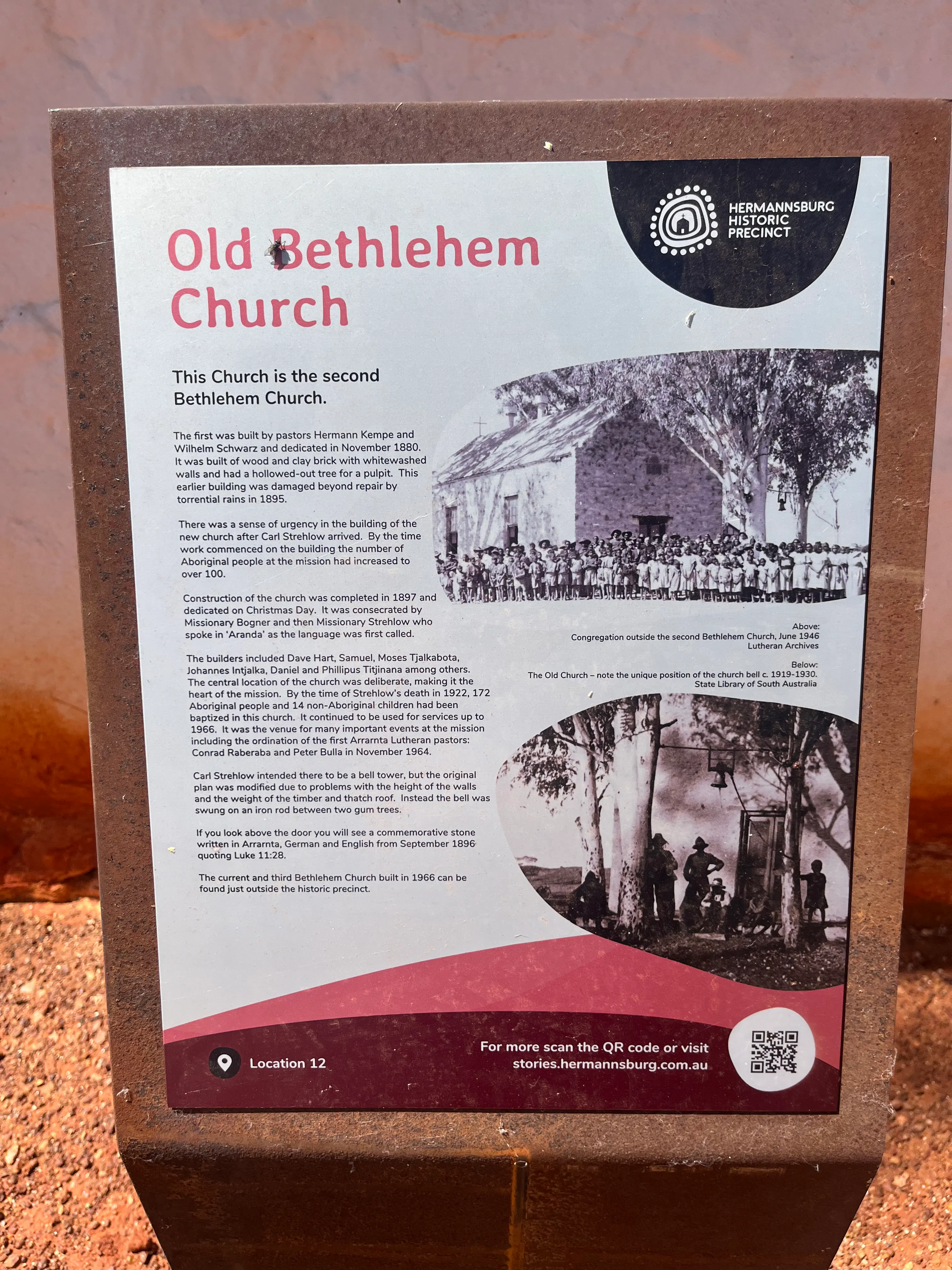 On Thursday we headed into Ntaria (Hermannsburg) to visit the historic precinct. The precinct is the site of a Lutheran mission that was established in 1877, and was handed back to the local Western Arrente people in the 1980s. It's a complicated and complex place - as with all former missions, it is representative of many of the major crimes of colonisation, particularly in terms of the theft of traditional lands. However, the Hermannsburg Mission did take a different approach to many in that the traditional Arrente language wasn't suppressed as other languages were on other missions. In particular, one of the founding German Lutheran missionaries had a particular interest in and talent for languages so learned several Aboriginal languages and translated important bible verses into Arrente. I thought it was particularly lovely that the commemorative stone from 1896 above the door to the old church has a bible verse written three languages - English, German and Arrente.