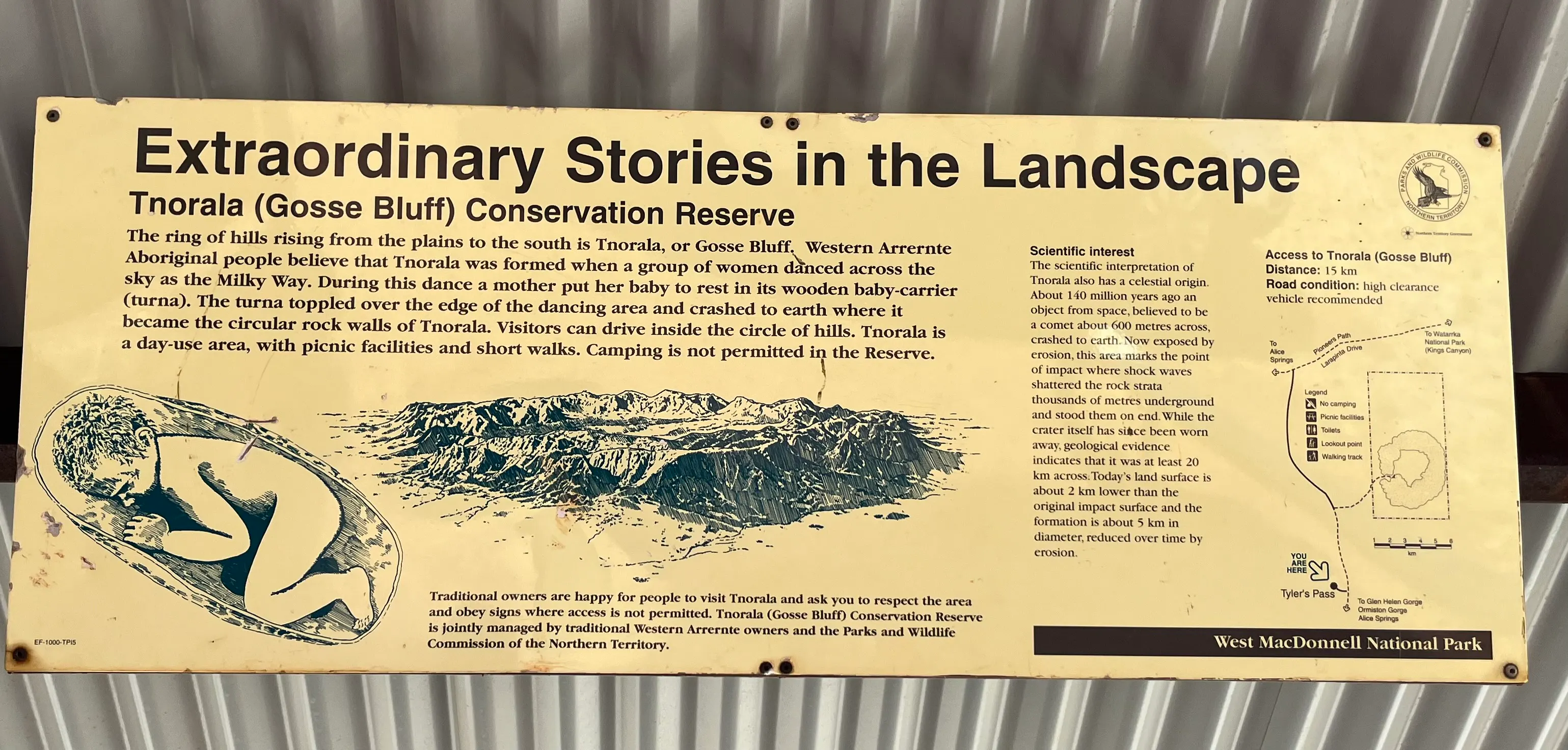 Unfortunately we were still a long way away from the crater, and the air quality was pretty terrible due to a bush fire somewhere in the area, so we didn't get a good photo of the crater. But I loved the creation story told on this info panel about the creation story of the Western Arrente people, in which a group of female creation spirits were dancing across the sky as the Milky Way. While the were dancing a mother put her baby in a wooden baby carrier which toppled over the edge of the dancing area and crashed into the earth, creating the circular rock walls of Tnorala.