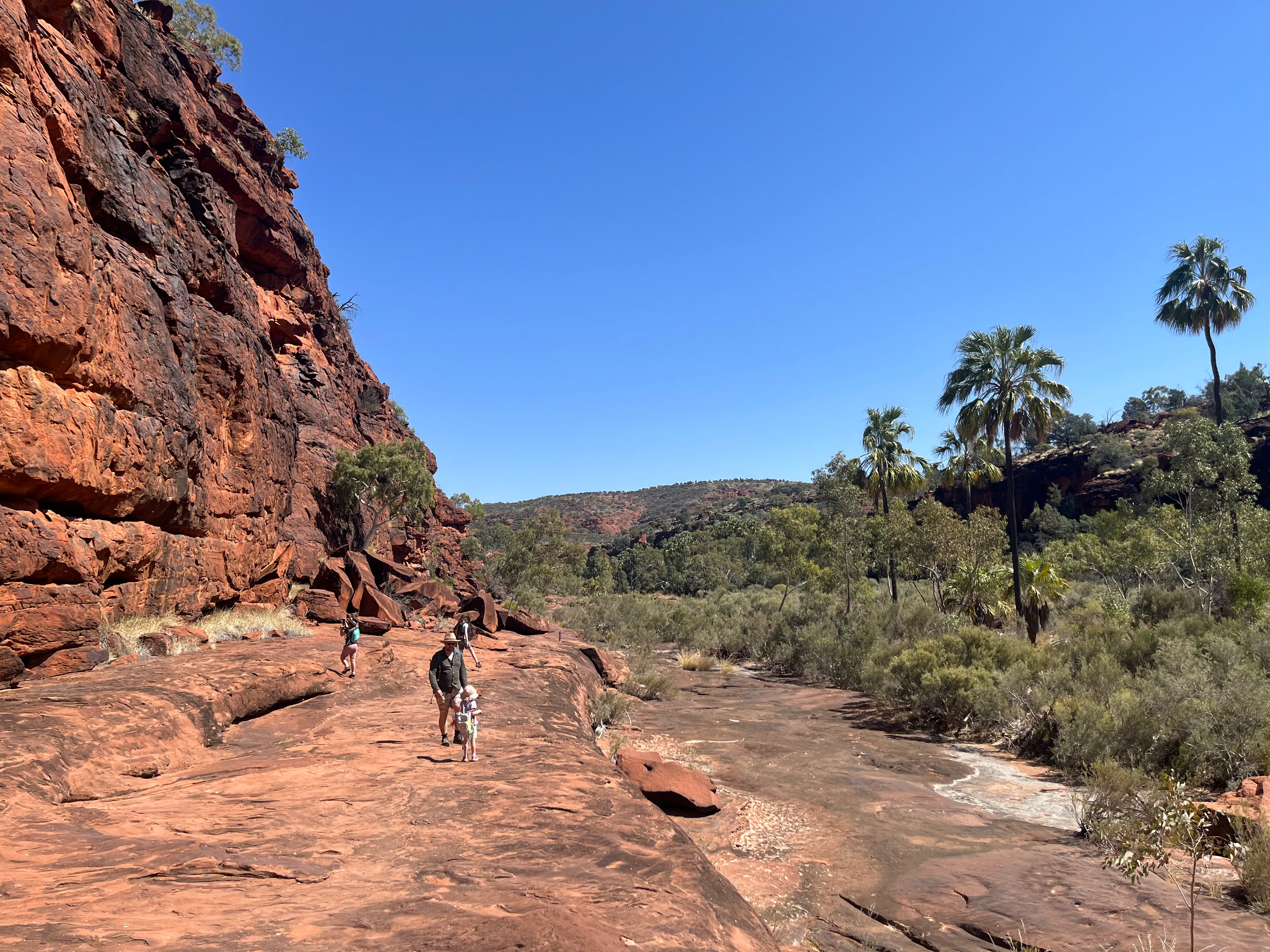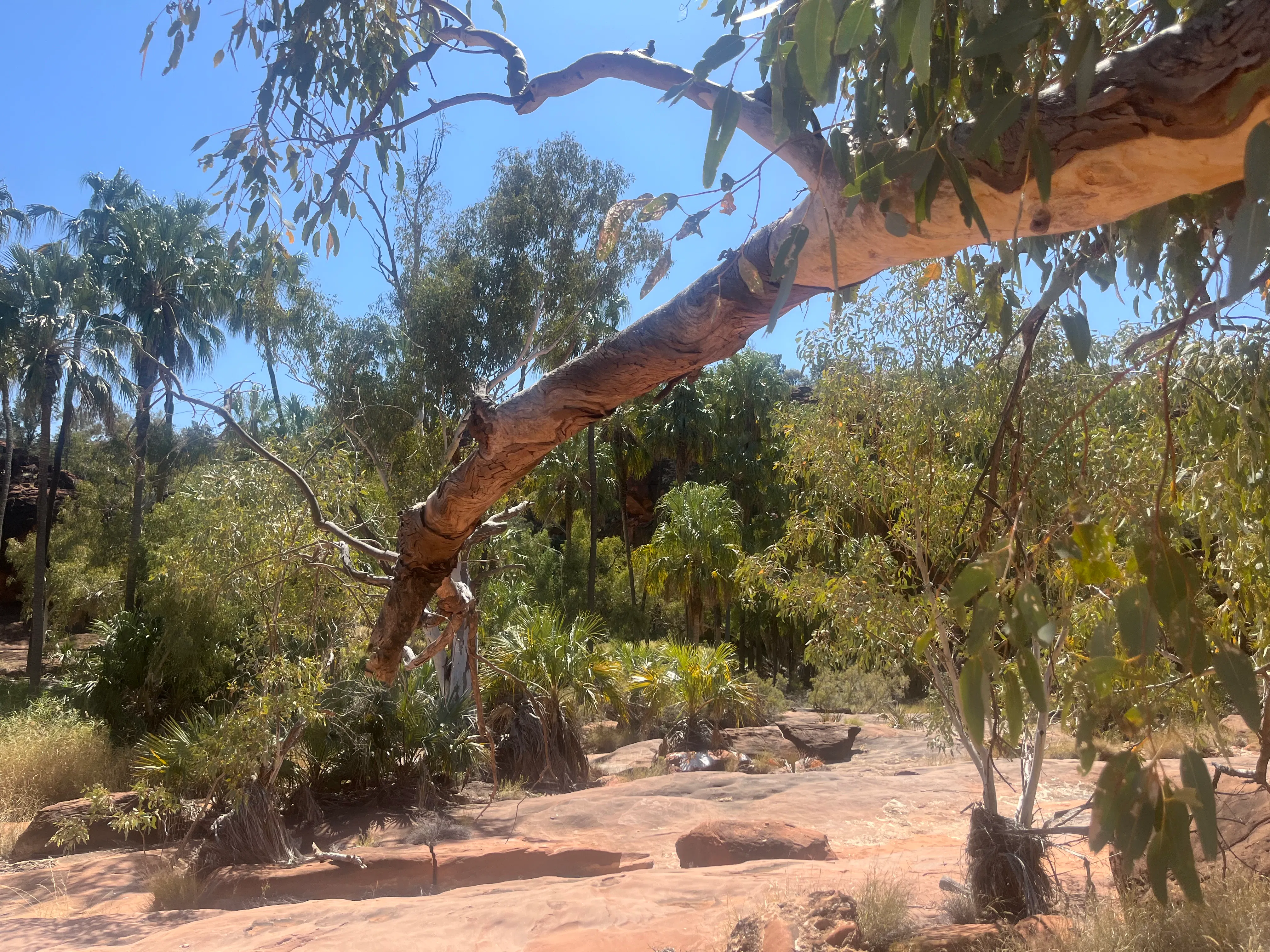 On Monday we drove the extra 4 kms of intense 4WD-ing to make it into Mpulungkinya (Palm Valley) proper. It's an amazing part of the world, with the English name reflecting the colony of Red Cabbage Palms found in the valley and surrounds, which is the only place it was found in Central Australia. For a long time scientists assumed that the palms were remnants of a prehistoric time when the climate supported tropical rainforest in what is now the arid inland of Australia. However more recent research proved that the palms are actually the same species as those found in Katherine and Mt Isa, both around 1,000 kms away. So the latest thinking is that the seeds may have been brought to Palm Valley by travelling Aboriginal communities and/or migrating birds.