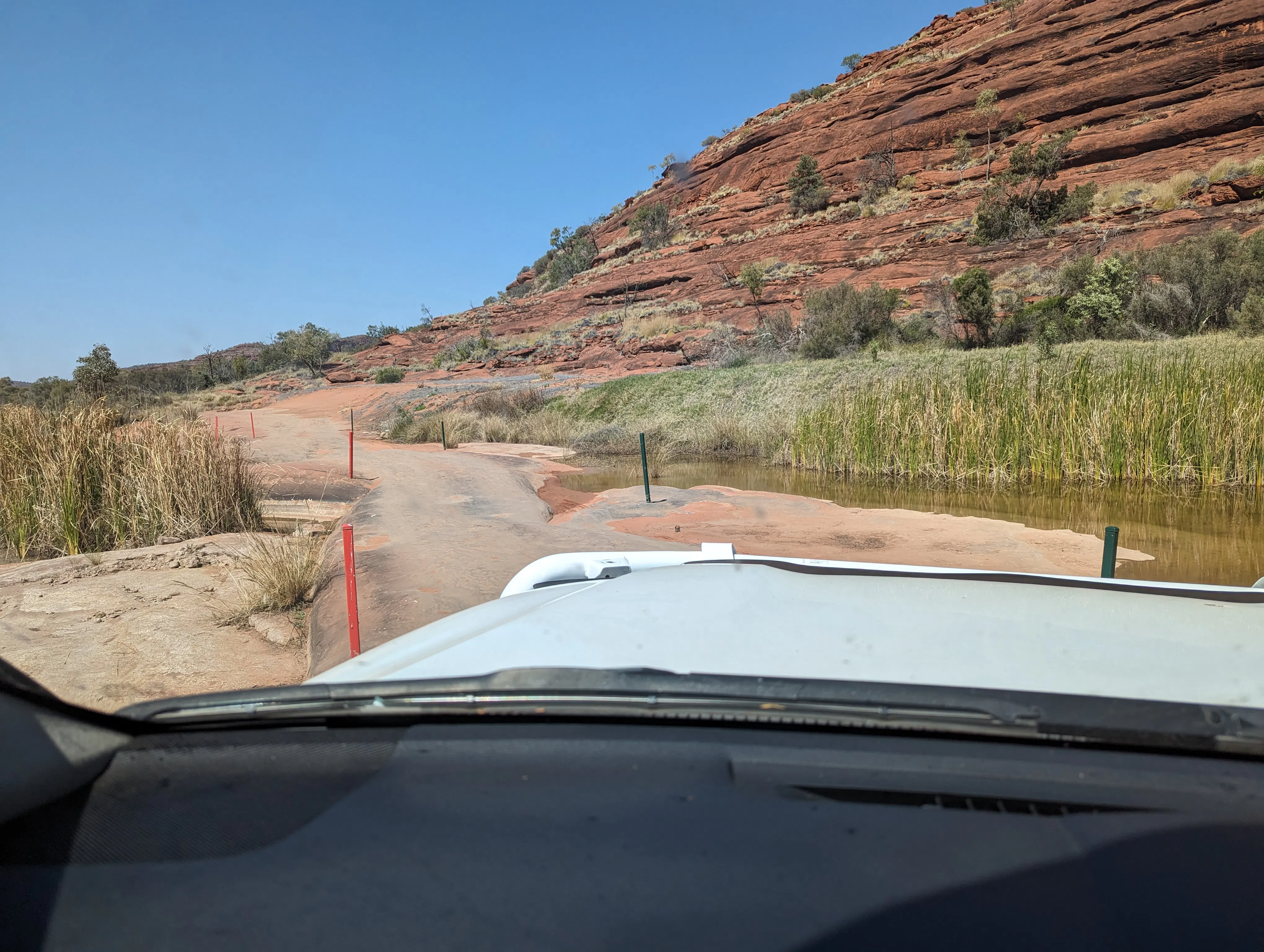 Technically on the drive out, but as a good as an example of photographic evidence of the intensity of the 4WD-ing to get into the valley proper. There were slalom poles to keep us on the path as we did a rocky river crossing! Bob drove us in, and I got us out. Very exciting!