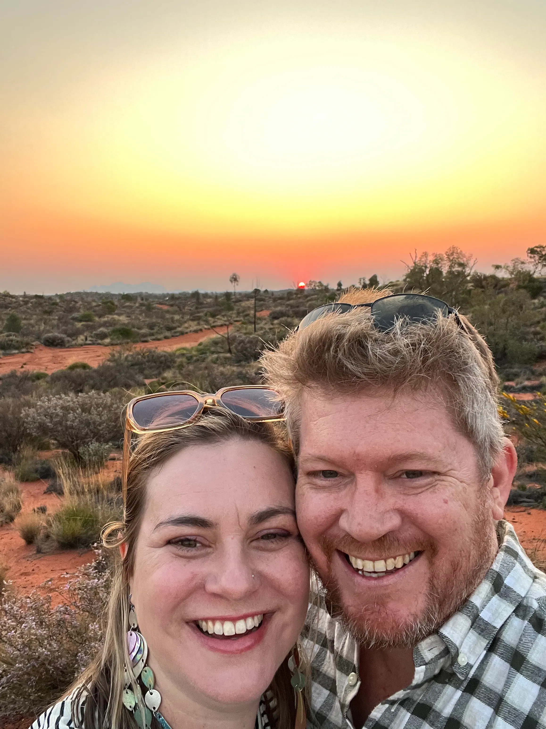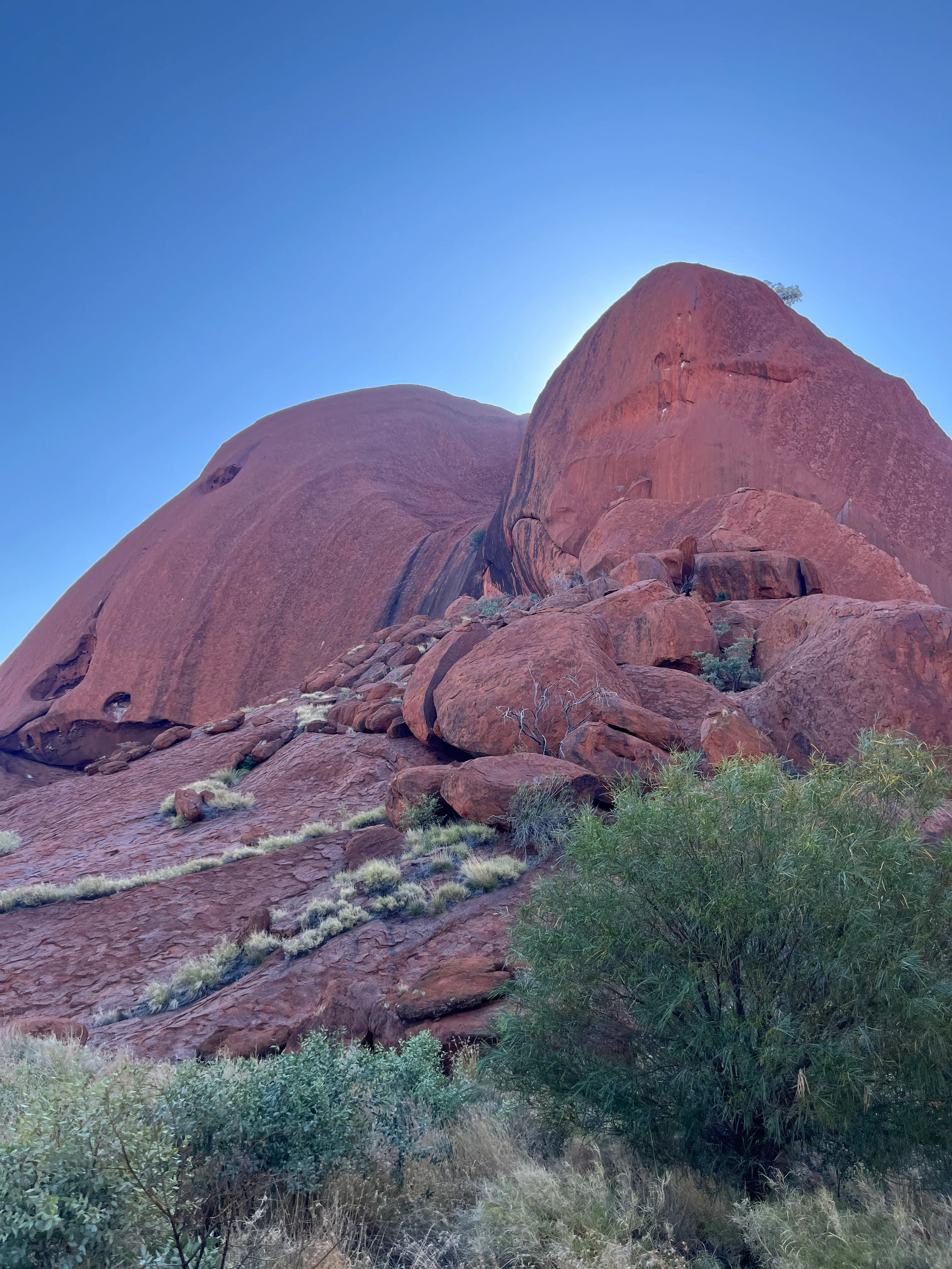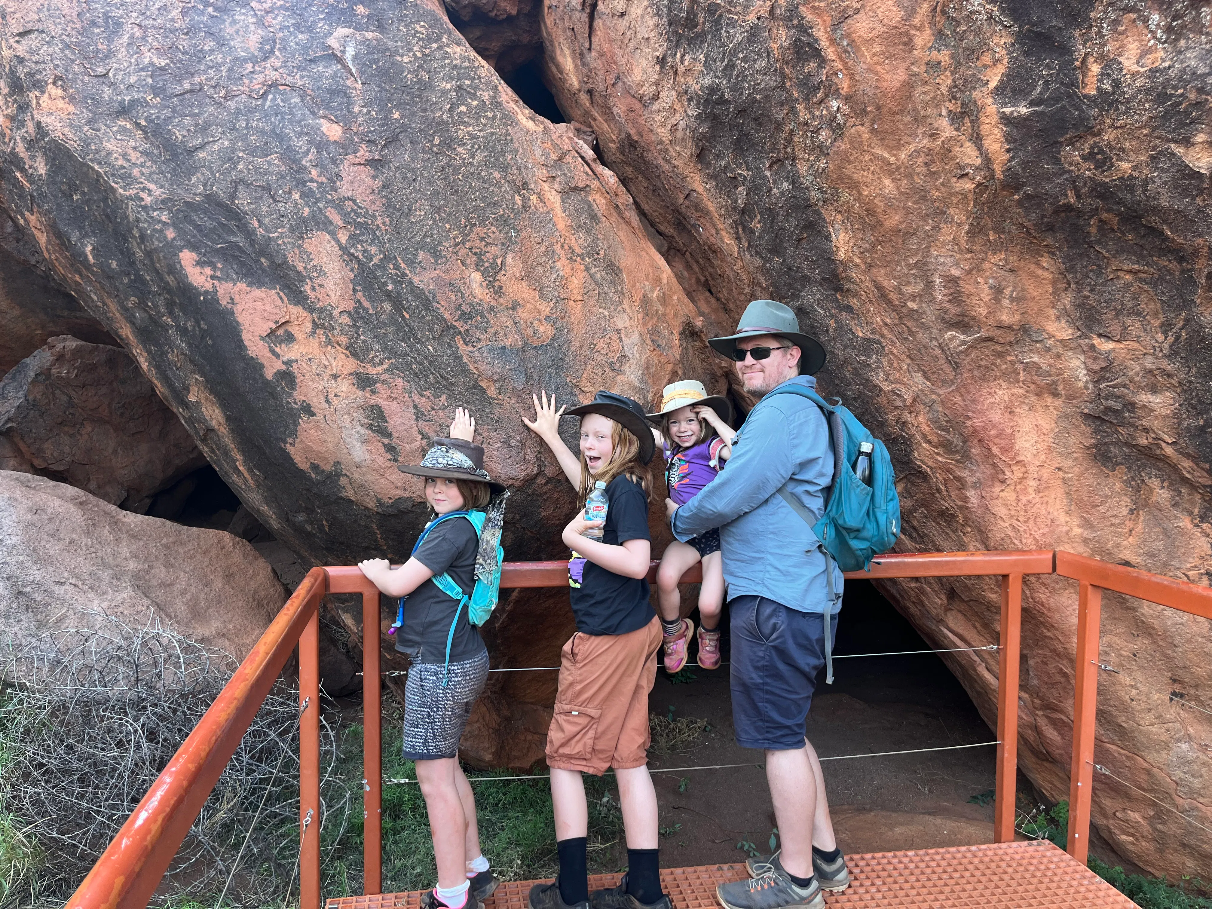 On Wednesday afternoon Bob and I were very, VERY lucky to have a bit of alone time while the kids hung out with GG. Given our morning nap we decided to head out to Kata Tjuta to attempt do the walk in the Valley of the Winds. Unfortunately we left it a bit late so only made it to the 2nd lookout halfway around the loop, but we still really loved it. Just the difference between composition on the rock between Uluru and Kata Tjuta is fascinating - Kata Tjuta is made of composite rock with big river pebbles and Uluru is made of sandstone. They are both created from the fast erosion of a mountain ranges millions of years ago, with the debris and sediment settling in large depressions in the earth that were then solidified under an inland lake and pushed up a few million year later (I'm sketchy on the timelines) due to shifting tectonic plates. The Valley of the Winds is a sacred site for the local men, so there are significant restrictions on where we could take photos, but the composite rock did remind me of a chocolate slab made with left over mini Easter eggs.....