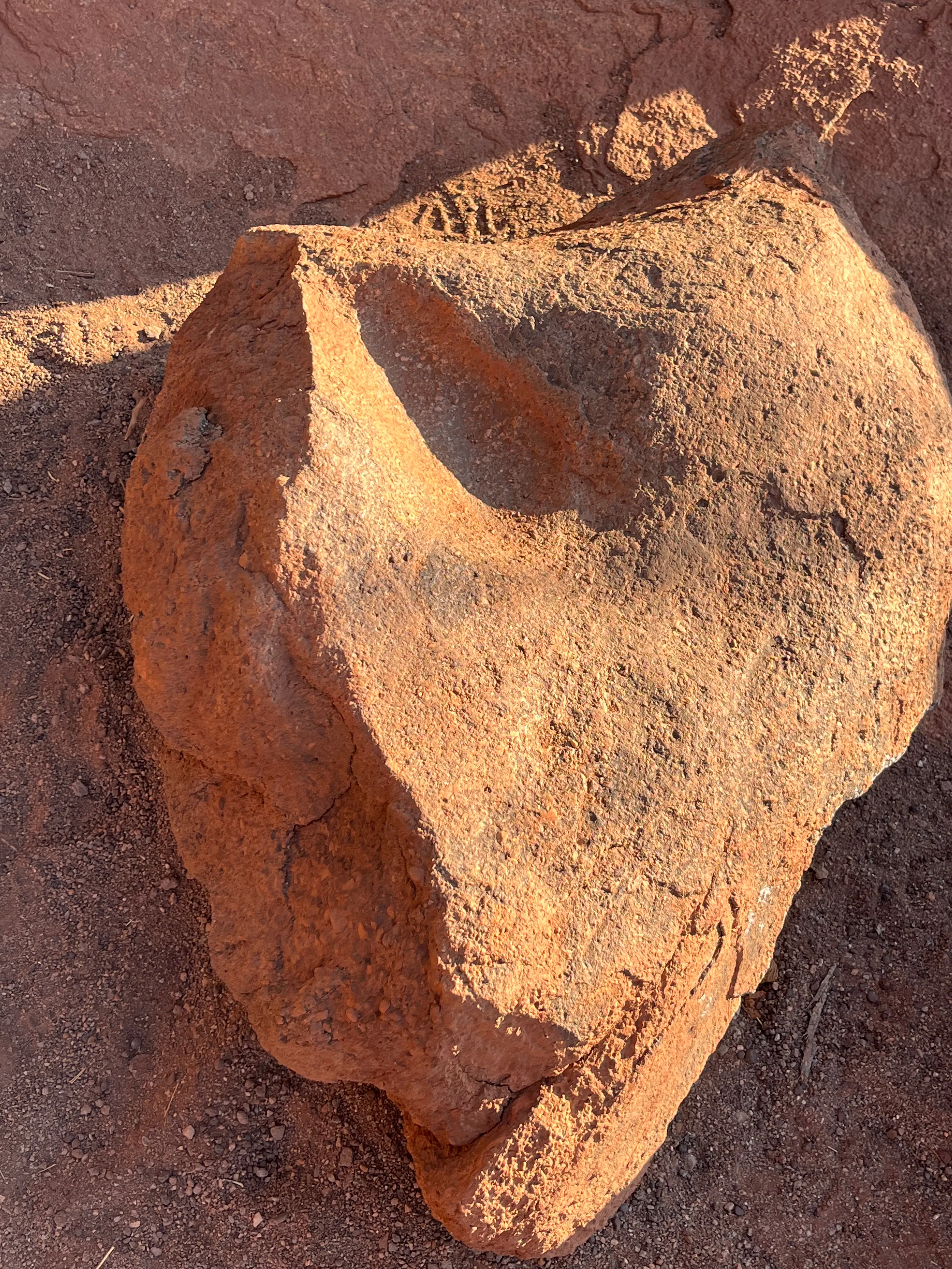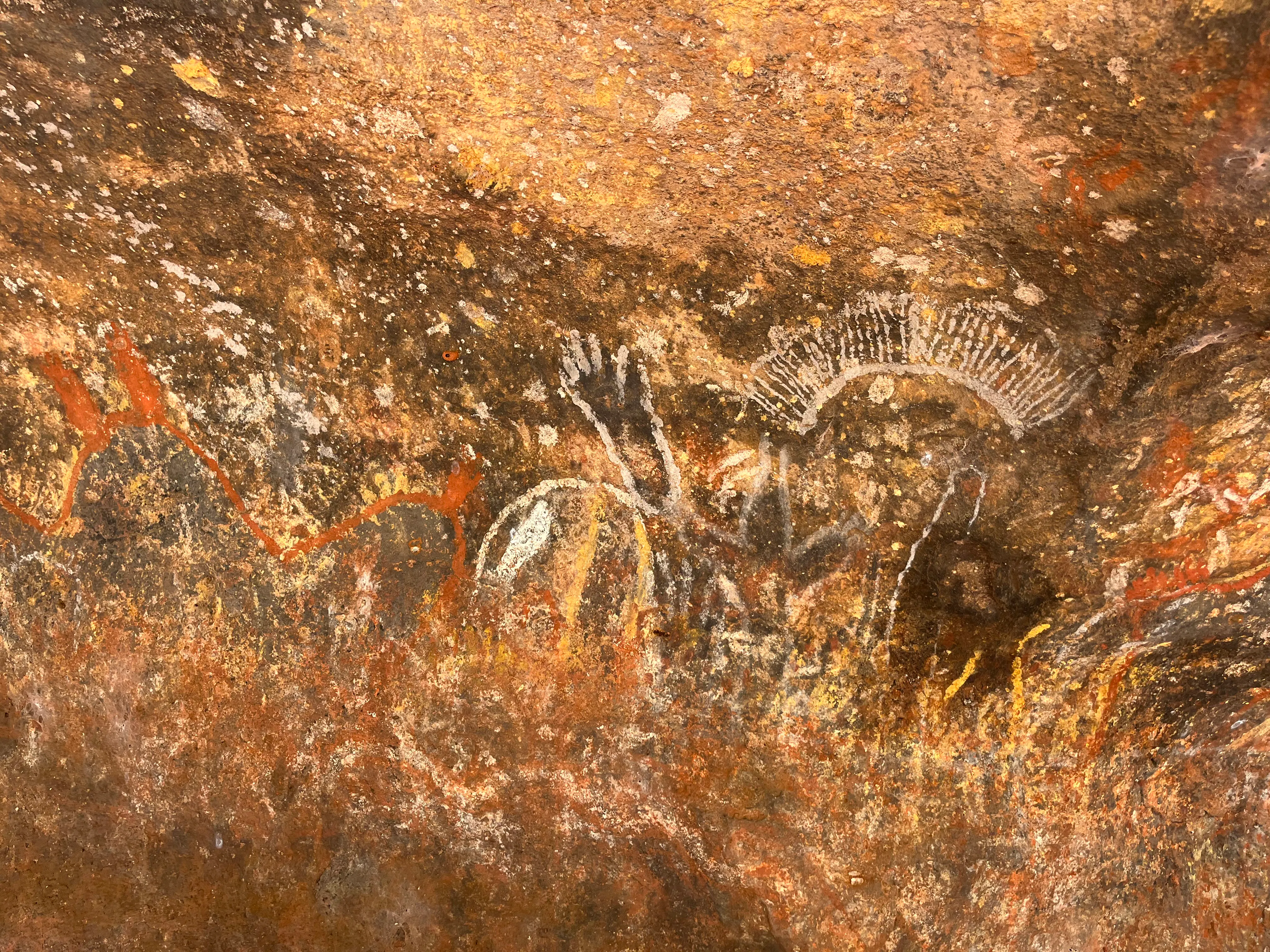 This was an amazing spot where we could reach up and feel some ledges on the back side of the overhanging rock that were incredibly smooth to touch. The painted symbols visible on this side of the rock indicates what was stored in the ledges - they are emu tracks, flagging that emu fat had been stored for hundreds if not thousands of years. Very cool.